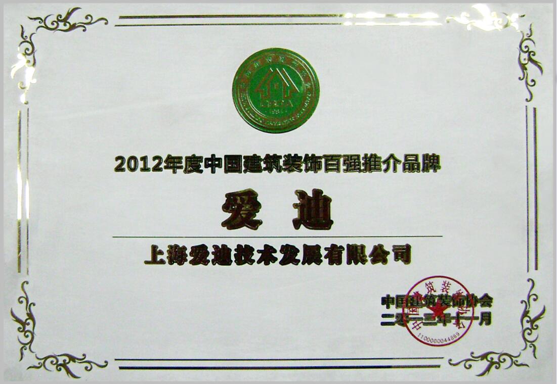 中國建筑裝飾百強聯合推薦品牌—獎狀