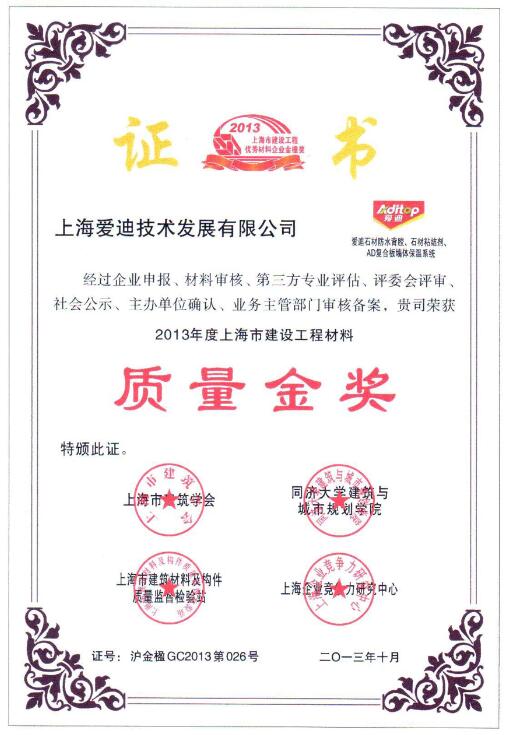 上海市優秀建筑裝飾材料—石材防水背膠—獎杯
