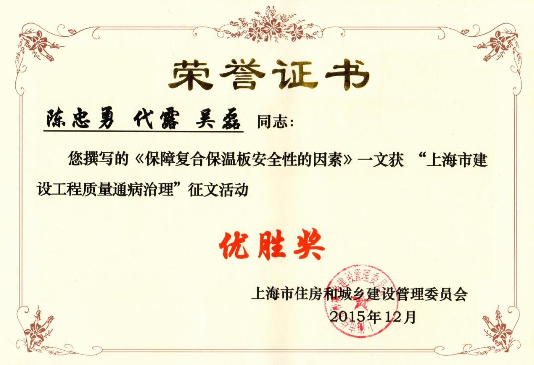 《保溫板安全因素》獲上海市建設工程質量通病治理