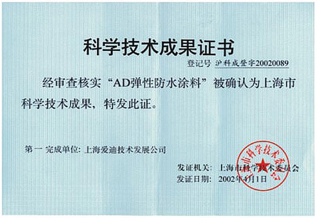 AD彈性防水涂料科技成果證書